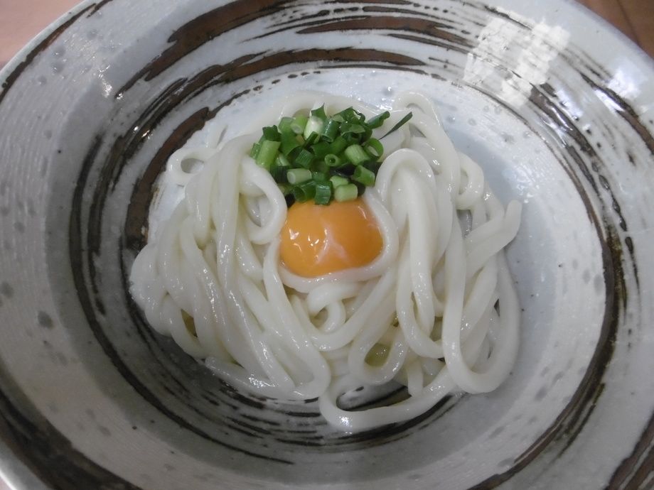 釜揚げした汁なしうどんに薬味、生卵をいれた香川では、王道のうどん 卓上のだし醤油と、胡椒で、リピート間違いなしの抜群のお味に!